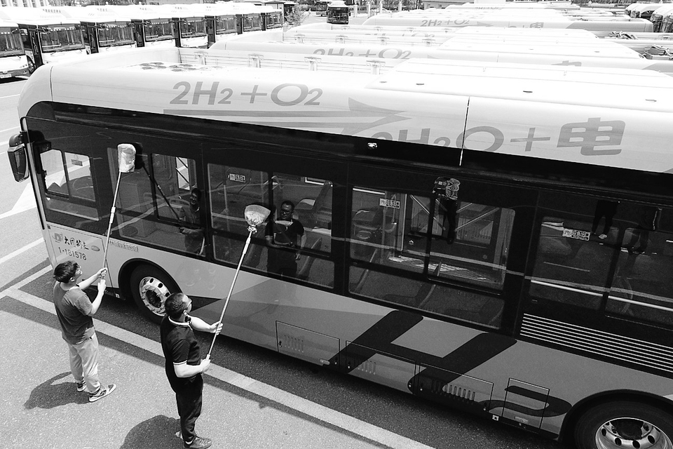 6月3日,在大同市公交一公司,職工們正在為氫燃料公交車做日常清潔。在大同市轉(zhuǎn)變能源利用方式,打造氫能產(chǎn)業(yè)示范應(yīng)用高地,爭當(dāng)能源革命尖兵中,大同市公交公司率先投入50輛氫燃料電池公交車試運營,讓氫能走進了百姓生活,預(yù)計明年氫燃料電池汽車運行規(guī)??蛇_到3000輛。