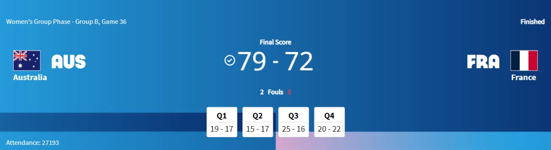 中新網(wǎng)北京8月5日電(記者 劉星晨)北京時(shí)間5日凌晨,巴黎奧運(yùn)會(huì)女籃小組賽全部結(jié)束。在最后一場(chǎng)比賽中,澳大利亞女籃79:72戰(zhàn)勝東道主法國(guó)女籃。本場(chǎng)取勝后,澳大利亞女籃以2勝1負(fù)的戰(zhàn)績(jī)出線(xiàn)。