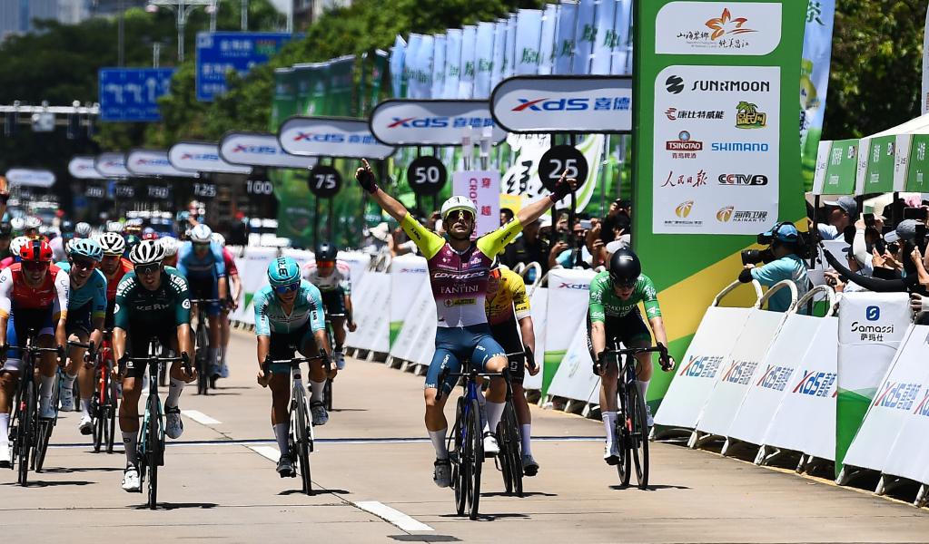 8月27日,意大利克羅蒂克車隊車手馬雷奇科(前)率先沖線后慶祝。新華社記者 楊冠宇 攝 作為當(dāng)日的沖刺王,這名意大利車手還贏得了綠衫。西班牙科恩制藥車隊的安吉爾和飛銳快客洲際車隊的馬丁分列賽段二、三位。 環(huán)島賽第一賽段設(shè)在瓊海,車手上午10點從市政廣場出發(fā),途經(jīng)博鰲亞洲論壇永久會址、潭門漁業(yè)小鎮(zhèn)、南海博物館等知名地標(biāo),全程95.6公里。 中國車手在本賽段表現(xiàn)不俗。巴迪瑞洲際車隊的王奎程摘得象征亞洲最佳車手的藍(lán)衫,五指山1867車隊的薛超華以爬山王身份穿上圓點衫,同隊的于澤獲得“敢斗獎”。