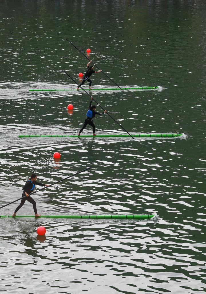 6月11日,選手在貴州省鎮(zhèn)遠(yuǎn)縣?陽河上進(jìn)行獨(dú)竹漂比賽。新華社記者 楊文斌 攝