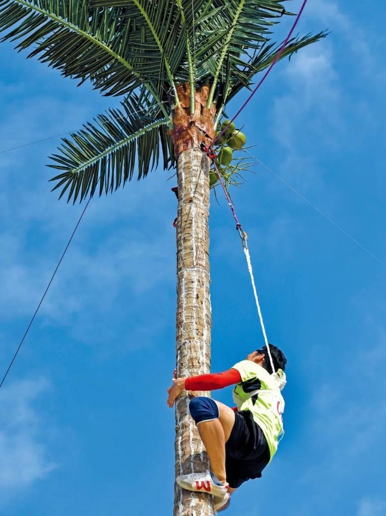 攀椰競(jìng)速是本屆運(yùn)動(dòng)會(huì)新增競(jìng)賽項(xiàng)目。比賽中,運(yùn)動(dòng)員要在9米(女子為7米)高的仿真椰子樹上攀爬,用時(shí)最短者獲勝。