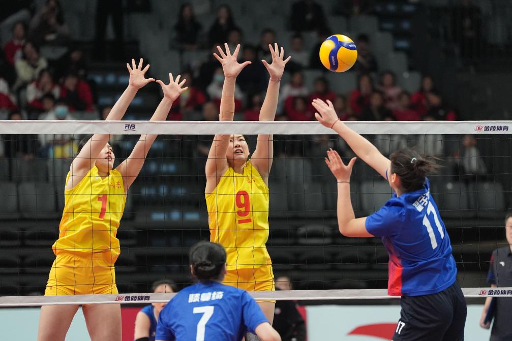11月27日,山東隊球員李晨瑄(中)、李美君(左)在比賽中攔網(wǎng)。當日,在湖南省長沙市賀龍體育館舉行的中華人民共和國第一屆青少年三大球運動會排球女子決賽中,山東隊3比0戰(zhàn)勝江蘇隊,獲得冠軍。新華社記者 薛宇舸 攝