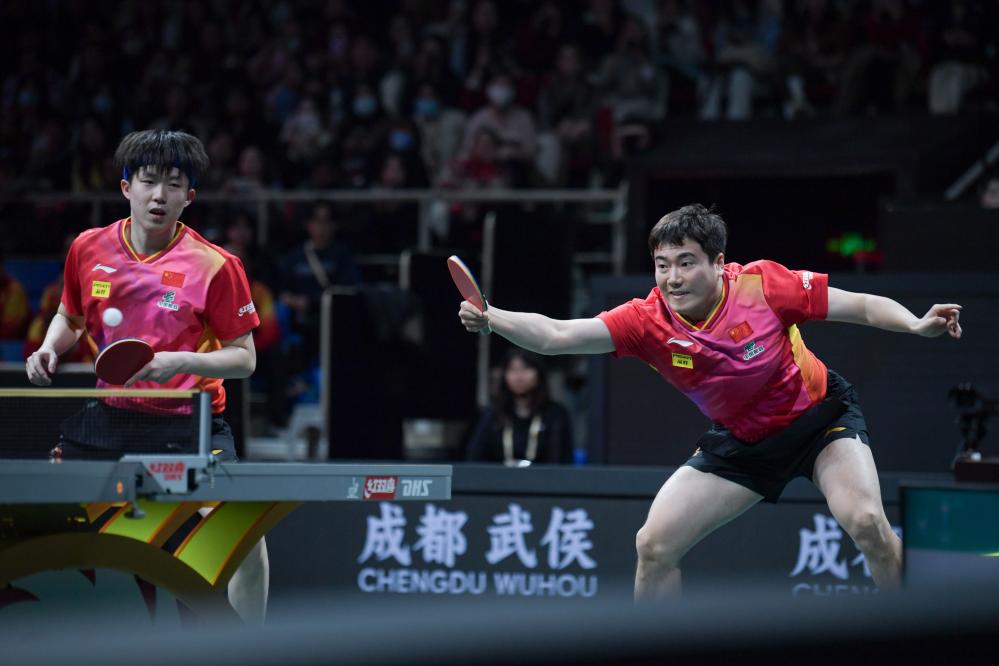 12月5日,中國隊組合王楚欽/梁靖崑(右)在男雙比賽中。新華社記者 王曦 攝