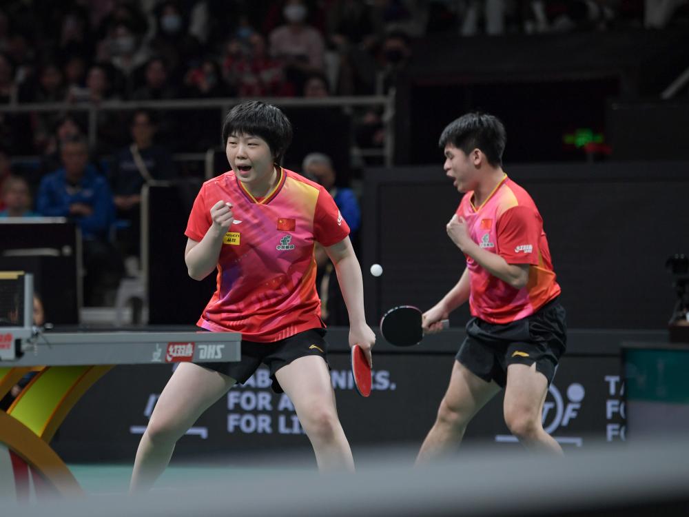 12月5日,中國隊組合王楚欽(左)/孫穎莎在混雙比賽中。新華社記者 江宏景 攝