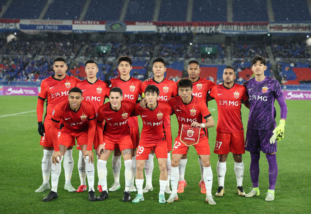 3月11日,上海海港隊首發(fā)球員在比賽前合影。新華社記者 賈浩成 攝