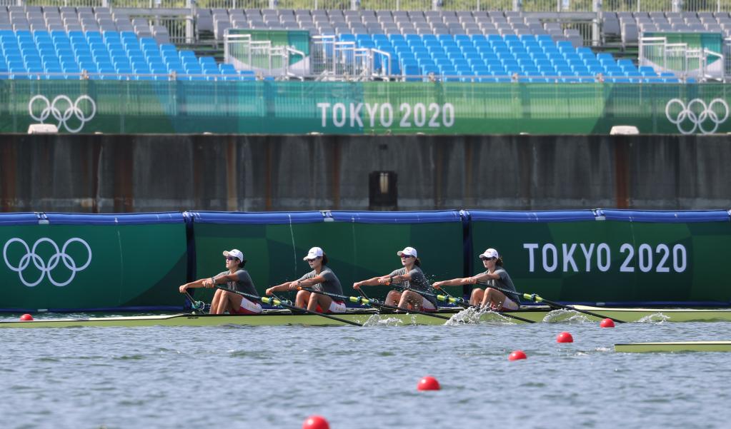 2021年7月20日,中國賽艇隊女子四人雙槳隊員在訓練中。當日,中國賽艇隊在日本東京海之森水上競技場訓練,備戰(zhàn)即將開幕的東京奧運會。新華社記者 杜瀟逸 攝