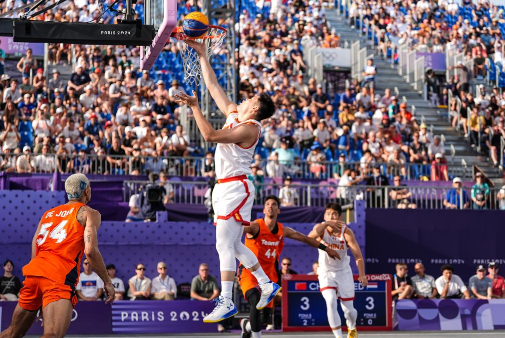 2024年7月30日,中國隊(duì)球員張寧(上)在巴黎奧運(yùn)會三人籃球男子分組循環(huán)賽中上籃。新華社記者 朱崢 攝