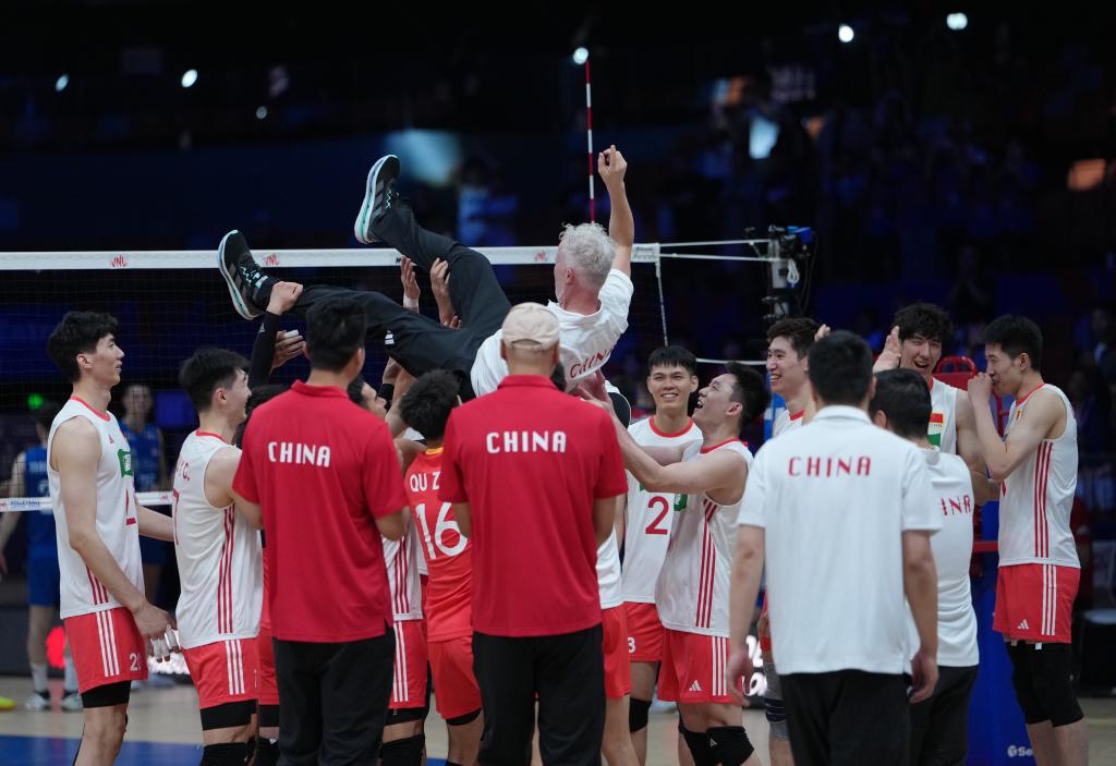 6月12日,中國(guó)隊(duì)球員在比賽后拋起主教練海寧(上)慶祝。新華社記者 李一博 攝