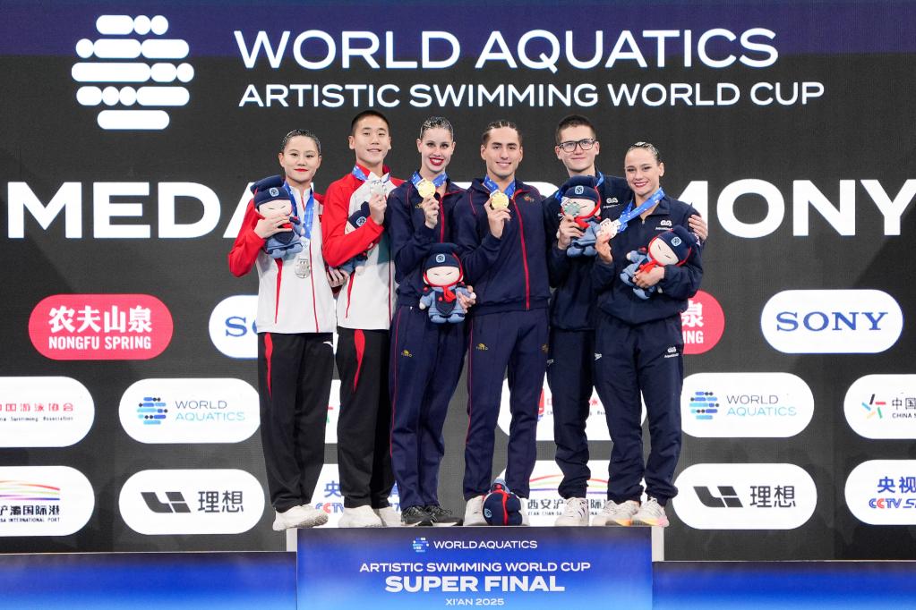 混合雙人自由自選比賽中,西班牙組合岡薩雷斯/卡薩斯以290.2184分奪得金牌。中國組合郭牧也/劉津含呈現(xiàn)了以《莫比烏斯》為主題的節(jié)目,收獲一枚銀牌。英國組合索普/湯布林位列第三名。