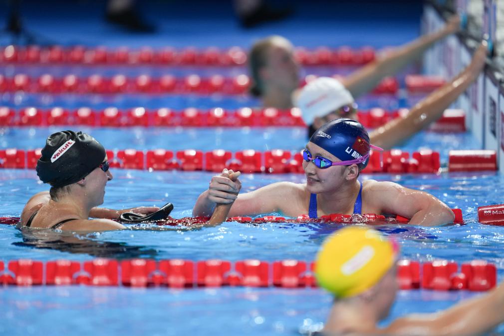 7月27日,李冰潔(右中)在比賽后與萊德茨基握手致意。新華社記者 伍志尊 攝