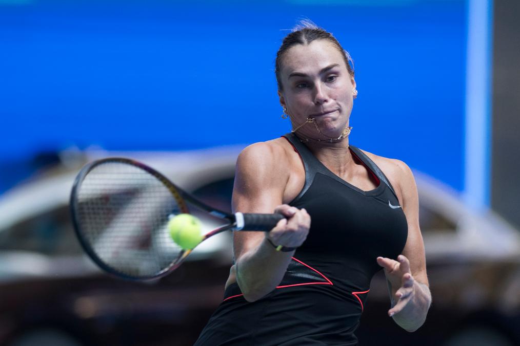 10月10日,薩巴倫卡在比賽中回球。新華社記者 伍志尊 攝