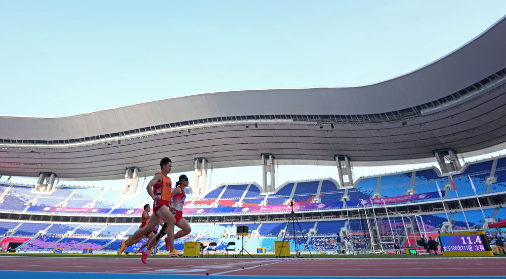 當(dāng)日,伴隨著提振人心的醒獅表演,田徑、聾人籃球等項目都在簡短的開賽儀式后進(jìn)入競賽環(huán)節(jié)。在廣東省奧體中心體育場舉行的田徑比賽傳來捷報,巴黎殘奧會兩銀得主、山東選手郭芊芊在女子400米T35級比賽中,以超世界紀(jì)錄、破全國紀(jì)錄的1分14秒65率先沖線。兩屆殘奧會冠軍、陜西隊的董飛霞在女子鉛球F55級比賽中摘下桂冠。在她的鼓勵下,陜西隊當(dāng)天一共獲得6枚田徑金牌。