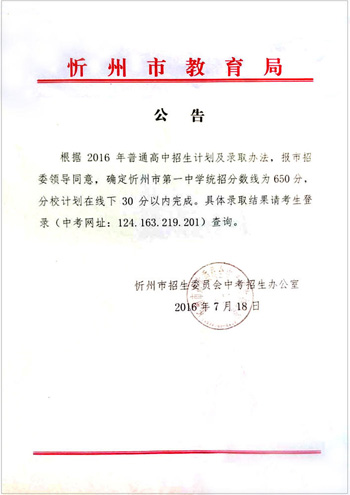 根據(jù)2016年普通高中招生計(jì)劃及錄取辦法,報(bào)市招委領(lǐng)導(dǎo)同意,確定忻州市第一中學(xué)統(tǒng)招分?jǐn)?shù)線為650分,分校計(jì)劃在線下30分內(nèi)完成。具體錄取結(jié)果請考生登錄(中考網(wǎng)址:124.163.219.201)查詢。