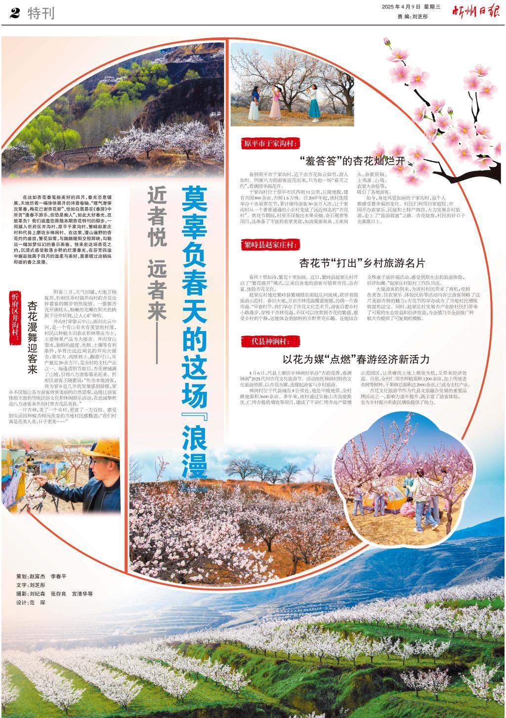 在這如杏花春箋般美好的四月,春光恣意鋪展,天地仿若一幅徐徐展開的詩意卷軸?!芭瘹鉂摯叽蔚诖海坊ㄒ阎x杏花新”,恰如白居易在《春游》中所言“逢春不游樂,但恐是癡人”,如此大好春光,豈能辜負(fù)?我們誠邀您跟隨本期杏花特刊的腳步,一同踏入忻府區(qū)井溝村、原平于家溝村、繁峙趙家莊村和代縣上磨坊鄉(xiāng)神澗村。在這里,漫山遍野的杏花灼灼盛放,繁花如雪,與融融暖陽交相輝映,勾勒出一幅如夢似幻的春日畫卷??靵砀斑@場杏花之約,沉浸式感受散落鄉(xiāng)野的爛漫春光,在芬芳四溢中邂逅獨(dú)屬于四月的溫柔與美好,莫要錯過這稍縱即逝的春之浪漫。