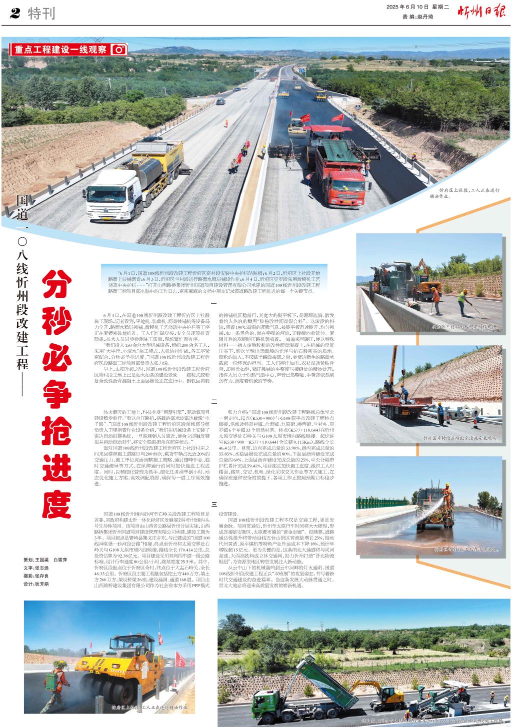 “6月1日,國(guó)道108線忻州段改建工程忻府區(qū)奇村段安裝中央護(hù)欄防眩板;6月2日,忻府區(qū)上社段開始路面上層鋪瀝青;6月3日,忻府區(qū)蘭村段進(jìn)行路面水穩(wěn)層鋪設(shè)作業(yè);6月4日,忻府區(qū)豆羅段采用滑膜機(jī)工藝澆筑中央護(hù)欄……”打開山西路橋集團(tuán)忻州國(guó)道項(xiàng)目建設(shè)管理有限公司承建的國(guó)道108線忻州段改建工程路面三標(biāo)項(xiàng)目部電腦中的工作日志,密密麻麻的文檔中翔實(shí)記錄著道路改建工程推進(jìn)的每一個(gè)關(guān)鍵節(jié)點(diǎn)。