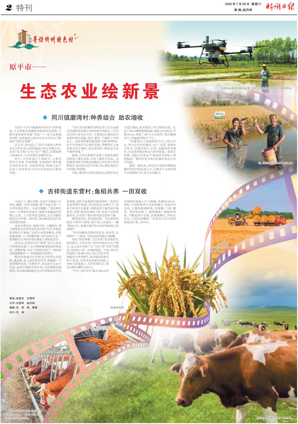 天涯山下,滹沱河畔,在原平市城東3公里處,藏著一處風(fēng)光旖旎、稻產(chǎn)豐饒之地——吉祥街道東營(yíng)村。從高空俯瞰,廣袤的稻田宛如一片碧綠色的海洋,鋪展在逶迤起伏的群山之間。七月的風(fēng)掠過稻浪,長(zhǎng)至齊膝的稻苗沙沙作響。稻田里,晃動(dòng)著農(nóng)民進(jìn)行田間管理的身影。