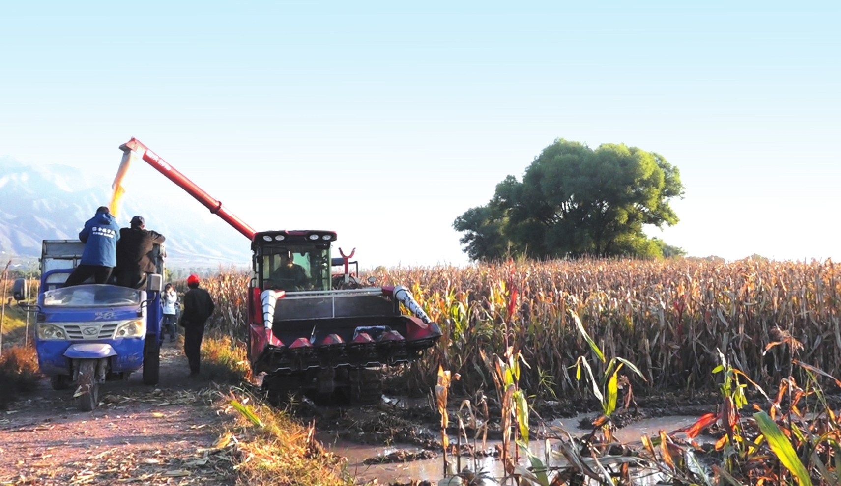 “突突”的引擎聲在濕漉漉的玉米地里轟鳴,來回穿梭中,金色的玉米在“吞吐”下脫粒,隨后如溪流般源源不斷地傾瀉而出,精準(zhǔn)地落入一旁等候的運(yùn)輸車廂內(nèi),瞬間堆起了一座座豐收的小山。