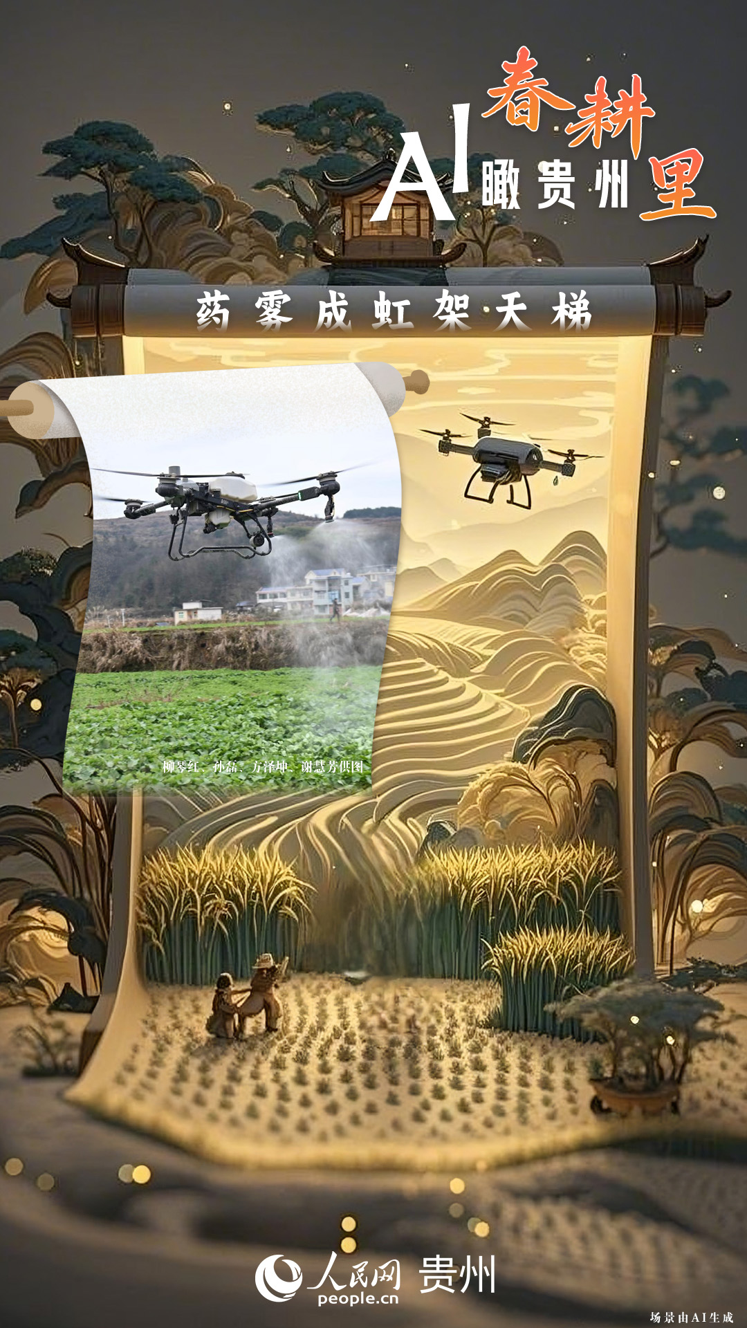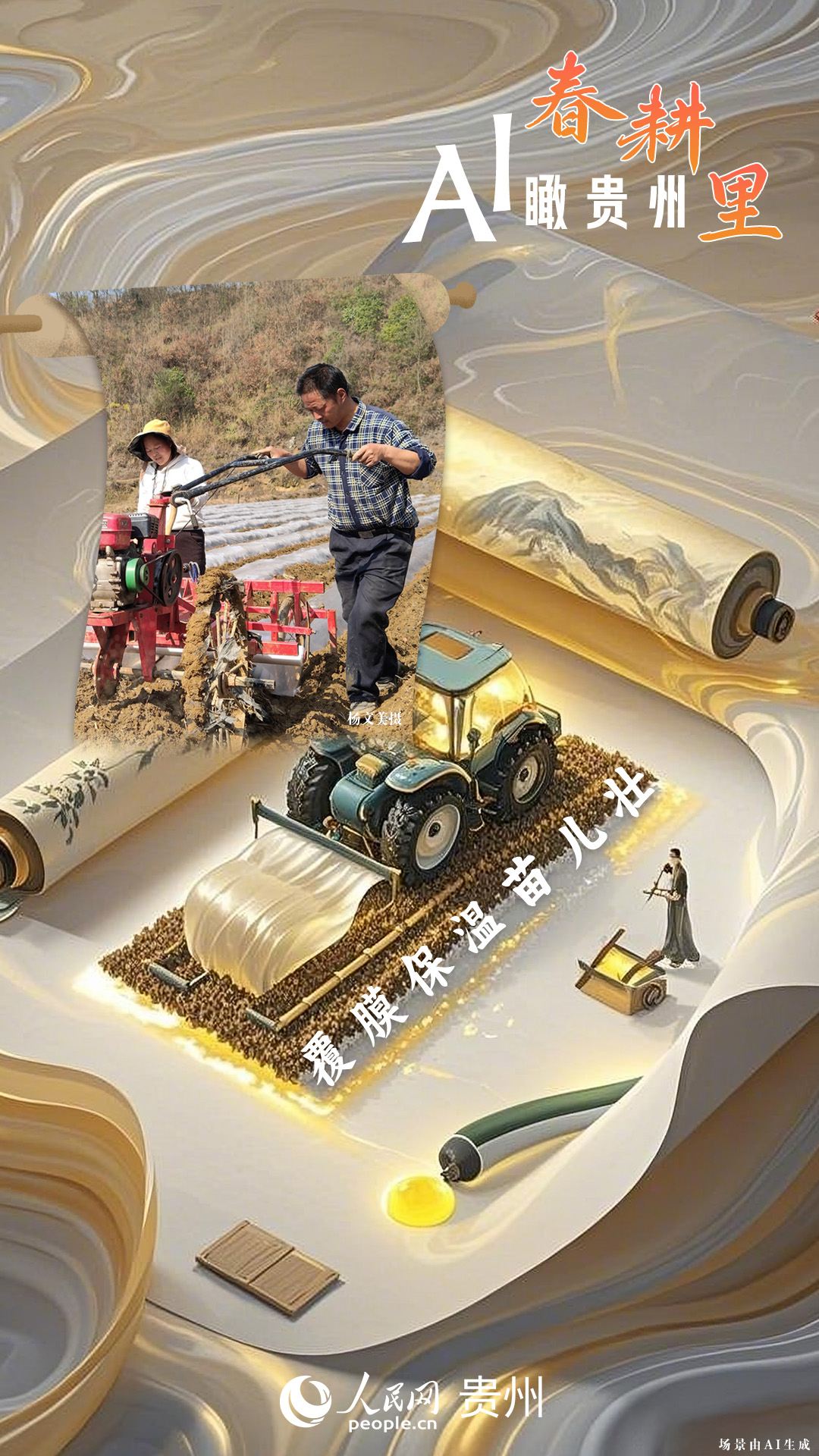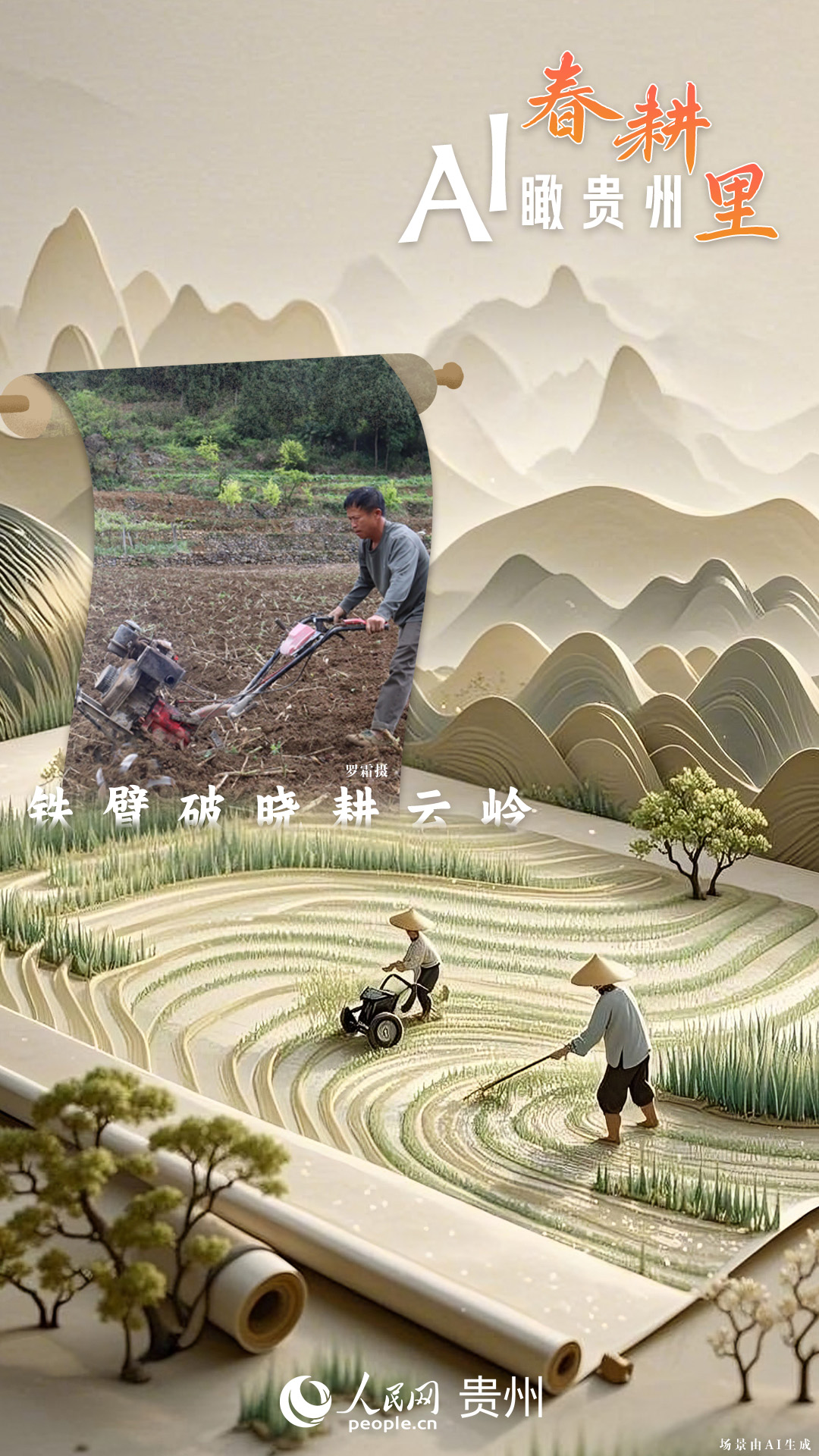 春回大地,萬物復(fù)蘇,黔地山川間正上演著一場(chǎng)生機(jī)勃勃的春耕盛景。傳統(tǒng)農(nóng)耕與現(xiàn)代科技在這里交織,描繪出一幅幅充滿希望的畫卷。 春耕不僅是農(nóng)時(shí)的序曲,更是科技與土地對(duì)話的現(xiàn)場(chǎng)。在貴州這片喀斯特地貌與民族文化交織的土地上,春耕正經(jīng)歷一場(chǎng)靜默的變革:無人機(jī)掠過千年梯田,算法解析紅壤墑情,覆膜機(jī)織就“智能外衣”,而彎腰勞作的農(nóng)人,依然用繭手傳遞著古老農(nóng)耕文明的溫度。 本期跟隨AI一起描繪貴州春耕里的故事。