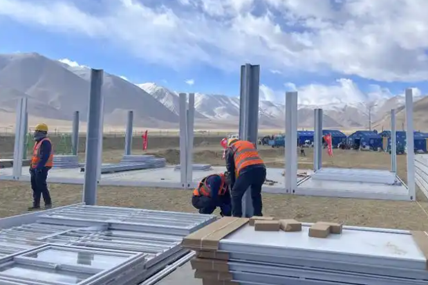 1月13日上午,中鐵二十局工作人員在定日縣措果鄉(xiāng)雪珠村安置點搭建活動板房。新華社記者蔣夢辰 攝