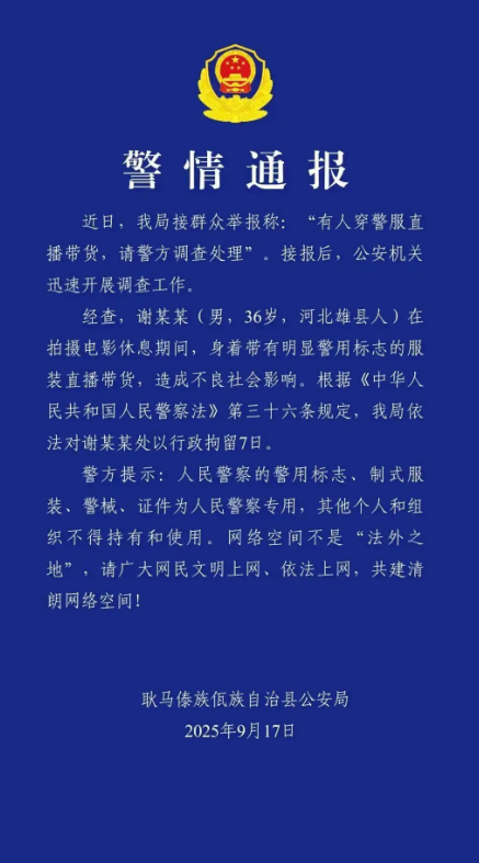 近日,演員謝孟偉(網(wǎng)絡(luò)俗稱“嘎子哥”)在直播帶貨過程中身穿警服,被公安機關(guān)依法處以行政拘留七日的處罰。該處理結(jié)果獲得輿論普遍支持,體現(xiàn)出社會對公權(quán)力象征符號神圣性的共同維護。據(jù)通報,謝某在電影拍攝休息期間,身著配有警用標(biāo)志的制式警服公開推銷電子產(chǎn)品,并聲稱“穿警服需通過政審”“公安機關(guān)應(yīng)當(dāng)配合工作”,企圖利用警服所承載的公信力為其商業(yè)行為背書。
