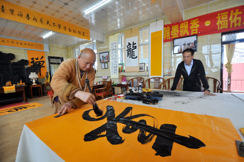 29日,中國(guó)佛教講經(jīng)交流會(huì)在五臺(tái)山召開之際,記者走訪了東臺(tái)頂望海寺釋覺一法師,他在勤修佛法的同時(shí)在書畫藝術(shù)上也自成一家。他認(rèn)為,佛法與書畫關(guān)系密切相通之處,學(xué)習(xí)佛法可促進(jìn)書法境界的提升,有助于佛法的弘揚(yáng)。