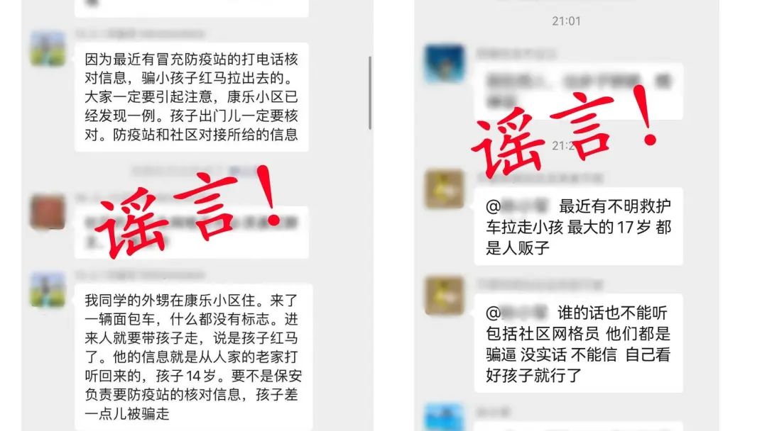 近日,本地微信群傳播:“最近有冒充防疫站的打電話核對信息,騙小孩紅馬拉出去的。大家一定要引起注意,康樂小區(qū)已經(jīng)發(fā)現(xiàn)一例”、“最近有不明救護(hù)車?yán)咝『ⅲ畲蟮?7歲,都是人販子”。