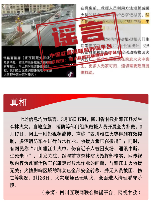 為博流量炮制安全類謠言,引發(fā)恐慌。春季歷來是森林火災(zāi)高發(fā)時段。加之開春后,工廠企業(yè)復產(chǎn)復工,致災(zāi)因素明顯增多。3月,全國多地發(fā)生火災(zāi)事故,一些網(wǎng)民為蹭熱點、博流量,趁機編織謠言,引發(fā)公眾恐慌。3月中旬,四川省甘孜州雅江縣發(fā)生森林火災(zāi),在當?shù)貞?yīng)急、消防等部門組織救援人員全力撲救之際,卻有人編造“四川雅江山火救援力量正在撤出”“雅江仍有近千人被困火場”“雅江山火有三名撲火人員犧牲”等失實信息,嚴重干擾災(zāi)害應(yīng)急響應(yīng)和救援工作?!爸貞c南坪商業(yè)大樓火災(zāi)傷亡慘重”“湖南省長沙市天心區(qū)發(fā)生重大刑案,警方發(fā)布懸賞通告”“天津一銀行發(fā)生搶劫”等嚴重失實的涉公共安全類視頻流傳網(wǎng)絡(luò),或是造謠者自編自導,或是利用AI技術(shù)偽造,卻引發(fā)群眾恐慌、造成惡劣影響。此外,“綠得發(fā)黑的菠菜不能吃”“清明蔗、毒過蛇”等食品安全類謠言,則是利用了時令和人們對食物中毒的擔憂情緒,夸大其詞、危言聳聽,目的都是販賣焦慮、制造恐慌,進而吸引眼球、騙取流量。