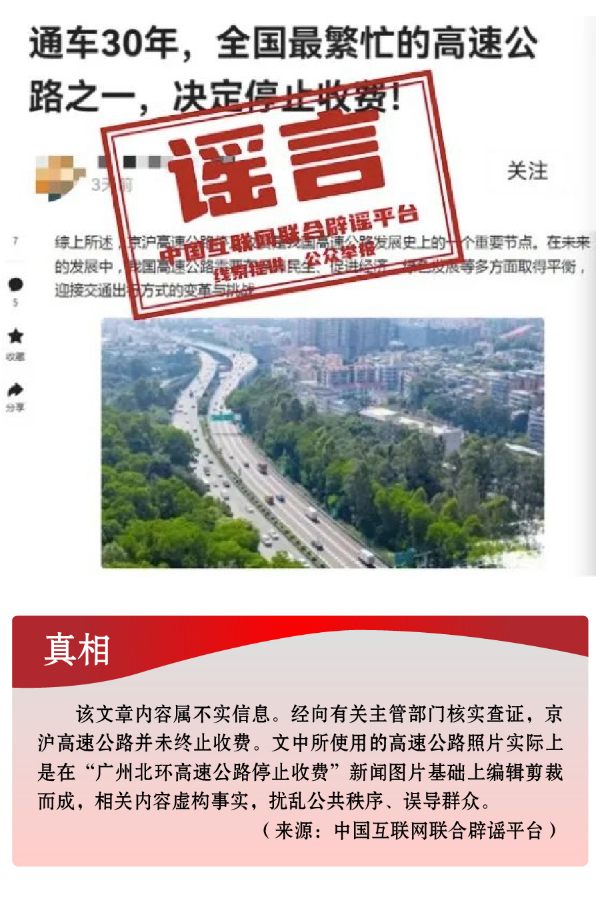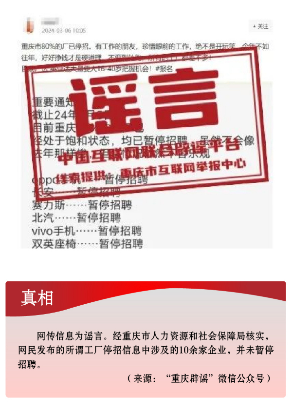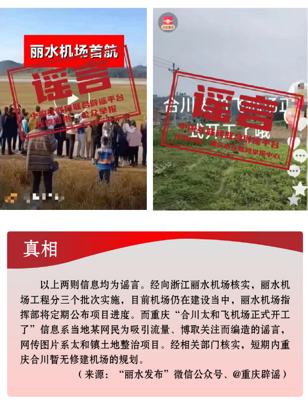 搭蹭熱點散播民生類謠言,渲染焦慮。3月,全國兩會召開,“民生清單”熱度高?!按赫小薄按河巍钡葧r間節(jié)點,有關(guān)招工就業(yè)、疫病傳染等內(nèi)容也成為個別網(wǎng)民博眼球的素材。一些個人或自媒體歪曲甚或虛構(gòu)事實,編造散布社會民生謠言,引發(fā)公眾不必要的焦慮。如,別有用心者惡意虛構(gòu)事實,發(fā)布“重慶80%的工廠暫停招聘”“湖南郴州疫情卷土重來”等虛假信息,渲染負面情緒、徒增公眾憂慮、擾亂社會秩序;還有人為吸引流量、博取關(guān)注,根據(jù)主觀臆想,采取移花接木等手段,散播“京滬高速公路停止收費”“浙江麗水機場已建成投用并首航”“重慶合川太和飛機場正式開建”等涉重大基礎(chǔ)設(shè)施建設(shè)項目的假消息,誤導公眾認知,擾亂群眾交通出行秩序。