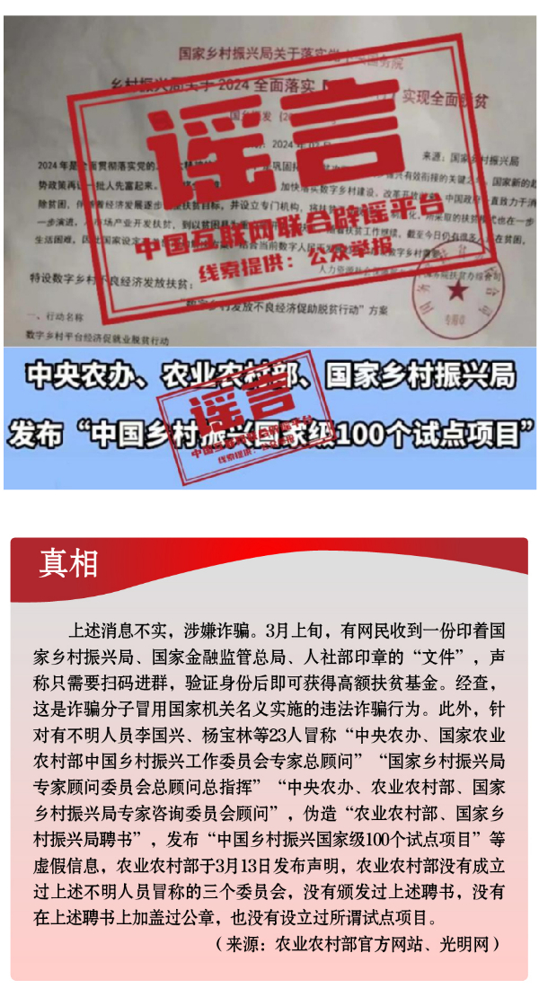 假冒權(quán)威杜撰政策類謠言,誤導公眾。3月以來,一些不法分子或機構(gòu)打著權(quán)威旗號,假冒國家機關(guān)、偽造政府公文、歪曲解讀政策,企圖行騙牟利。如,詐騙分子冒用國家機關(guān)名義,假稱“國家發(fā)放2024年鄉(xiāng)村振興扶貧補貼”“鄉(xiāng)村振興項目有國家級試點100個”“‘退稅綠色通道’加快退稅到賬速度”等,實施違法詐騙行為,給社會公眾造成極大信息和資金安全風險。還有人制造、傳播“我國城鄉(xiāng)居民醫(yī)保參保人數(shù)近年來持續(xù)下降,部分地區(qū)農(nóng)村出現(xiàn)醫(yī)保退保潮”“失業(yè)保險金只能領(lǐng)一次,最多領(lǐng)24個月”“我國社?;鹑冀唤o外資機構(gòu)管理”等一系列與事實嚴重不符的涉公共謠言,迷惑性大、蠱惑性強,極易誤導公眾,對我國現(xiàn)有社保政策和相關(guān)工作造成負面影響。