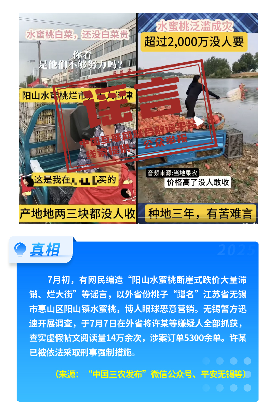 此外,7月份正值暑期旅游旺季和水果等農產品收獲季,有自媒體、商家借機編造傳播涉文旅及農產類謠言,干擾市場秩序,侵害消費者權益。有商家違規(guī)使用人民大會堂建筑圖片標識和名稱,仿冒人民大會堂賬號,非法售賣、倒賣參觀門票,損害游客權益。個別商家剪輯發(fā)布“江蘇無錫陽山水蜜桃斷崖式跌價、大量滯銷、爛大街”謠言視頻,再借機兜售假冒的陽山水蜜桃,博人眼球惡意營銷,擾亂市場秩序。所謂“峨眉山人猴大戰(zhàn),游客墜崖,猴王被當場擊斃”景區(qū)安全事件一度傳得沸沸揚揚,相關視頻以驚悚情節(jié)博取關注,畫面實際是用AI合成拼接制作。