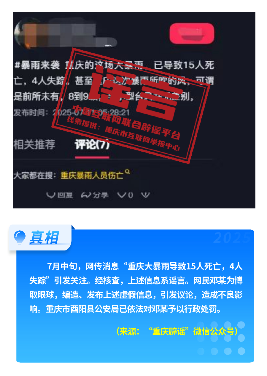 近期,網上接連出現發(fā)布虛假“警情通報”的惡性造謠傳謠案件,炮制傳播“昆明駕車撞人案131人死亡”“杭州自來水接入糞水”及涉釋永信虛假“警情通報”,模仿“藍底白字”格式,杜撰聳人聽聞細節(jié),損害政府公信力,嚴重擾亂社會秩序。“院士預測廣東將發(fā)生8級以上大地震”公然偽造專家聊天截圖,謊報地震預警。還有造謠者借盛夏高溫酷暑與洪澇災害,編造“安徽淮北、山東泰安等地多人因高溫死亡” “重慶大暴雨導致15人死亡、4人失蹤”等謠言,蹭炒熱點、煽動情緒。