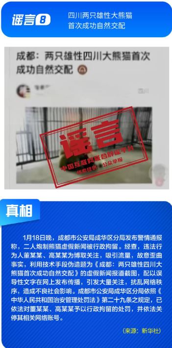 ??針對各類網(wǎng)絡謠言與亂象,多部門開展協(xié)同治理,聯(lián)動整治。1月16日,中央網(wǎng)信辦召開全國網(wǎng)絡辟謠聯(lián)動機制第三次全體會議,部署以辟謠工作新成效助力清朗網(wǎng)絡空間建設。中央網(wǎng)信辦聯(lián)合工業(yè)和信息化部等部門持續(xù)整治汽車行業(yè)網(wǎng)絡亂象,處置一批涉嫌挑動對立、炒作負面話題、違規(guī)測評的賬號;國家廣播電視總局開展“AI魔改”視頻專項治理,各平臺處置大量違規(guī)內(nèi)容。各地網(wǎng)信部門積極行動,陜西西安深入開展房地產(chǎn)領域網(wǎng)絡專項行動,處置散布樓市謠言的房產(chǎn)中介賬號,四川成都依法處置30余個惡意關聯(lián)地域、污名化城市的違規(guī)賬號。公安機關依法打擊造謠傳謠人員。擺拍“小女孩在學校跳蚤市場用50元淘到名酒”、利用AI偽造“假救護車非法轉(zhuǎn)運”、編造“兩只雄性四川大熊貓首次成功自然交配”等謠言的相關責任人已依法被予以行政處罰。