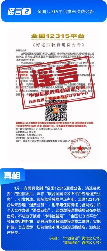 ??公共政策領域謠言誤導公眾決策?!吧绫?]有有效期限制、未到期不能換新卡”是對社保卡管理政策的誤讀,給民眾平添困擾;“28家博物館元旦期間閉館”實為少數(shù)博物館根據(jù)運營安排所做的微調(diào),網(wǎng)帖嚴重夸大實際閉館情況,引發(fā)負面炒作;“深圳有望推行12年義務教育,高中免費”是對現(xiàn)行政策的“超前編造”,誤導學生及家長群體;“全國12315平臺發(fā)布退費公告”,則是假冒監(jiān)管機構(gòu)名義散播不實通知,為后續(xù)詐騙行為做鋪墊。