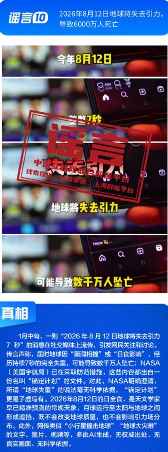 ??健康與科普領域謠言違背客觀規(guī)律?!叭搜椎鞍资恰黾用庖吡Α姆▽殹笨桃饪浯笤撎幏剿幍呐R床用途,忽略其特定醫(yī)療場景與使用風險;所謂“大棚草莓、冷庫葡萄、進口車厘子、染色砂糖橘是冬天水果界四大毒王”謠言片面解讀農(nóng)產(chǎn)品種植與保鮮方式,缺乏科學依據(jù);“四川兩只雄性大熊貓首次成功自然交配”純屬為吸引流量而捏造的獵奇內(nèi)容,其視頻畫面為AI生成;“2026年8月12日地球?qū)⑹ヒ?,導?000萬人死亡”更是無中生有的荒謬謠言。