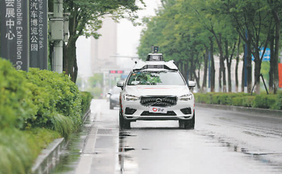 6月27日,上海啟動(dòng)智能網(wǎng)聯(lián)汽車規(guī)?;痉稇?yīng)用,一輛智能網(wǎng)聯(lián)汽車在路上行駛。