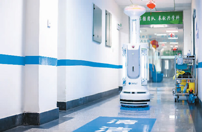 在四川德陽市人民醫(yī)院拍攝的工作中的鈦米消毒機(jī)器人。新華社發(fā)