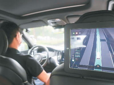 上海啟動(dòng)智能網(wǎng)聯(lián)汽車規(guī)模化示范應(yīng)用,首批智能網(wǎng)聯(lián)汽車在滴滴出行APP上開放服務(wù),可預(yù)約體驗(yàn)滴滴自動(dòng)駕駛。圖為主駕駛座上的安全員在車輛行駛時(shí)兩手放在方向盤旁,前排座椅背后的屏幕上實(shí)時(shí)顯示行人、車輛等周邊路況。新華社記者 丁 汀攝