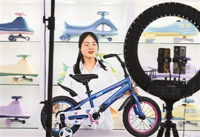 河北省邢臺(tái)市廣宗縣鐵牛自行車業(yè)有限公司的工作人員日前通過線上廣交會(huì)直播推介童車產(chǎn)品。王 壘攝(人民圖片)