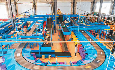 在湖南省永州市藍山縣創(chuàng)品國際智慧物流園,智能分揀系統(tǒng)對快件包裹進行有序分揀。彭 華攝(人民圖片)