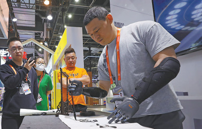 中國(guó)品牌博覽會(huì)上,工作人員用腦機(jī)科技操控的假肢寫(xiě)毛筆字。新華社記者 方 喆攝