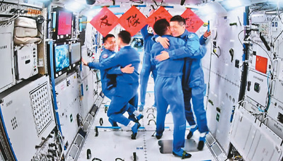 4月26日在軌執(zhí)行任務(wù)的神舟十七號(hào)航天員乘組順利打開“家門”,歡迎遠(yuǎn)道而來的神舟十八號(hào)航天員乘組入駐“天宮”。新華社記者 金良快攝