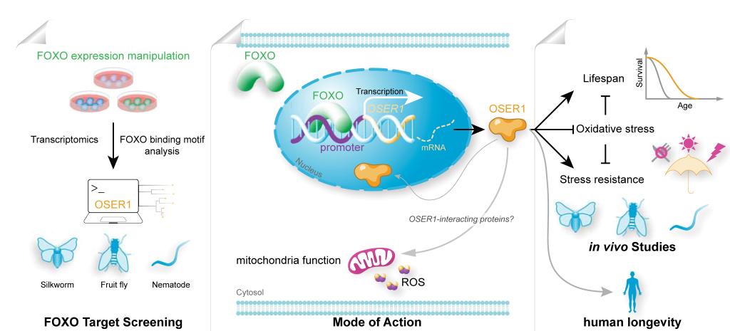 為了闡釋OSER1調(diào)節(jié)長壽的作用機(jī)制,研究團(tuán)隊(duì)在家蠶、線蟲和果蠅中進(jìn)行了一系列的分子生物學(xué)實(shí)驗(yàn)。研究結(jié)果共同表明,OSER1是叉頭框蛋白O的直接靶基因,OSER1能夠響應(yīng)過氧化氫誘導(dǎo)的氧化應(yīng)激,并通過提升機(jī)體氧化應(yīng)激防御力發(fā)揮延長壽命的作用。