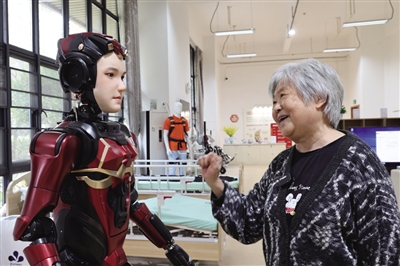 在深圳市養(yǎng)老護理院,一名老人與人形機器人“夏瀾”互動。新華社記者 梁旭 攝