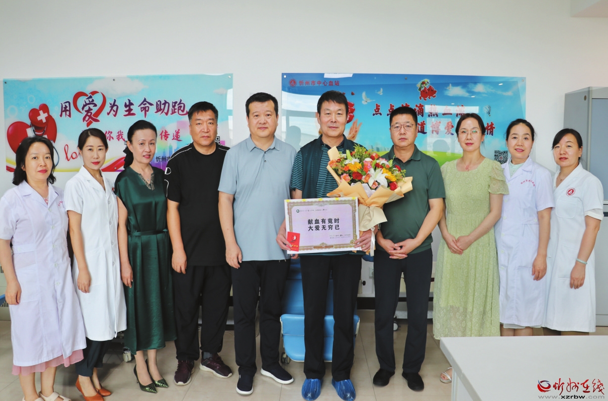 梁占海先生是我市繁峙籍人士,原計(jì)劃在7月18日,60周歲生日當(dāng)天完成最后一次獻(xiàn)血。連日暑浪滾滾,7月13日下午他瞅準(zhǔn)雨后氣溫下降的空隙,駕車125公里來(lái)到市中心血站,捐獻(xiàn)2治療量的血小板,在六十周歲生日,完成最后一獻(xiàn)“光榮退役”。血站郭建卿站長(zhǎng)率班子成員到現(xiàn)場(chǎng)慰問(wèn),對(duì)他發(fā)揚(yáng)人道主義精神,弘揚(yáng)助人為樂(lè)品德的行動(dòng)表示贊揚(yáng),對(duì)他為我市無(wú)償獻(xiàn)血事業(yè)做出的貢獻(xiàn)表示感謝。獻(xiàn)血結(jié)束后,中心血站的領(lǐng)導(dǎo)護(hù)士同梁占海先生合影留念,祝賀他花甲生日吉祥、身體健康。