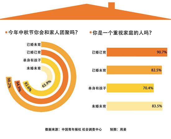 調(diào)查顯示,今年中秋節(jié),92.9%的受訪者會和家人團(tuán)聚。已婚未育的受訪者這一比例最高(98.2%),未婚未育受訪者這一比例最低(65.9%)。