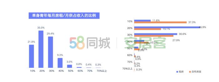 同時,還有50.1%的單身青年目前租房居住,居住成本是一筆不小的支出項,約65%的單身青年每月在房租/月供的開銷占收入的20-30%。