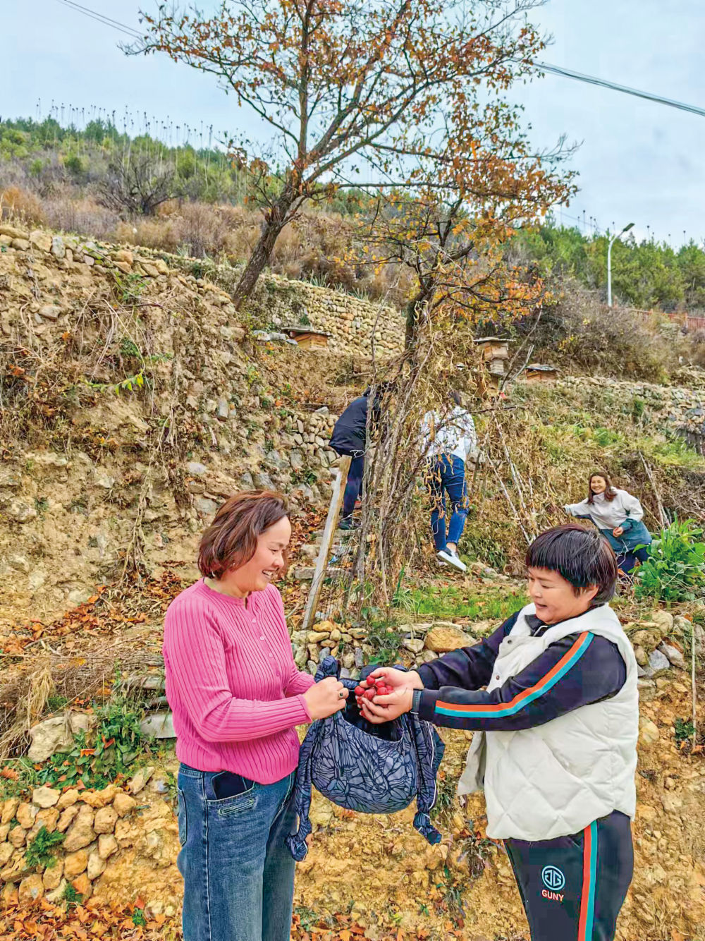 徜徉在小路上,偶遇從河南新鄉(xiāng)長垣市自駕而來的游客于女士一行人,她們正在山坡上采摘剛剛熟透的山楂。于女士告訴記者,她們這幾個鄰居經(jīng)常自駕來松廟村游玩,夏天時還常在村里小住。