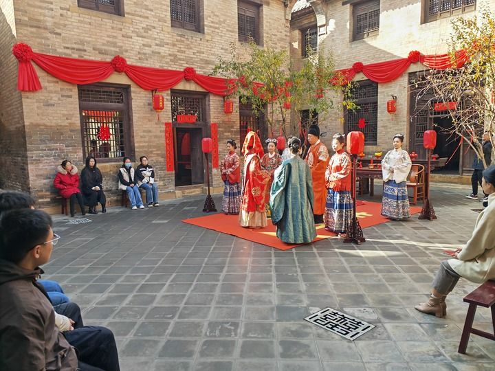 隨著演員齊聲吟誦,古院落中,一場明制出閣禮正在上演。不大的小院擠滿了觀禮游客,院外不少人沒擠進來,還在踮腳朝里望。這里是山西省高平市河西鎮(zhèn)的喜鎮(zhèn)蘇莊景區(qū)。