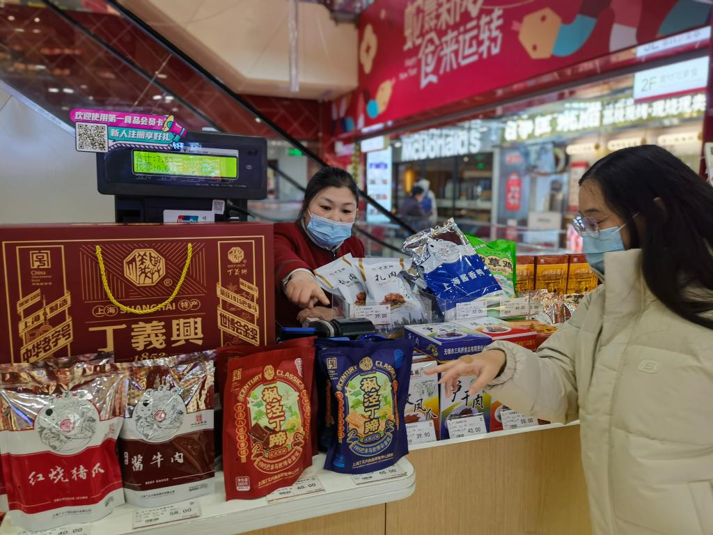 顧客在南京路步行街的第一食品商店購(gòu)買年貨。新華社記者 陳愛平 攝