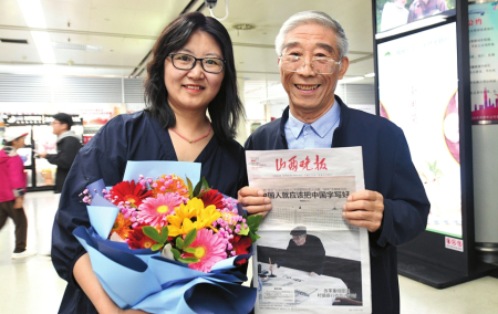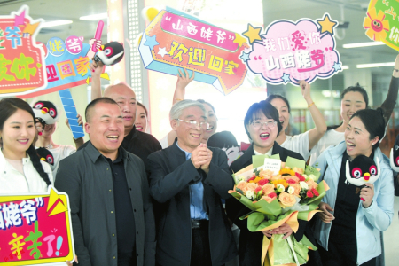 在接站口,“姥爺”接過(guò)記者遞上的鮮花,看到刊載報(bào)道他的4月2日的報(bào)紙,咧嘴一笑,一再說(shuō)“謝謝,謝謝”,記者用鏡頭和文字記錄下這份喜悅。交城縣委宣傳部也派出了接機(jī)小分隊(duì),打著“我們愛(ài)你,山西姥爺”等歡迎牌,把姥爺護(hù)送回家。
